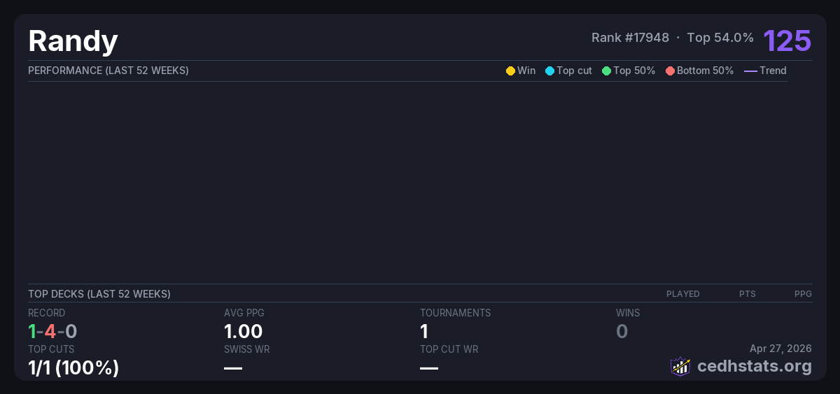 | Clash for the Cradle Sep 27, 2025 · 36 players | Invalid pairing | 15/36 | 1-4-0 | 1.00 | 125 |
