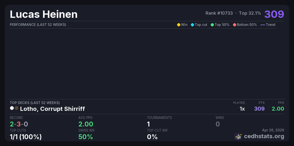 | Commander 500 - 2K - 25-04-2026 Apr 25, 2026 | Lotho, Corrupt Shirriff | 5/24 | 2-3-0 | 309 |