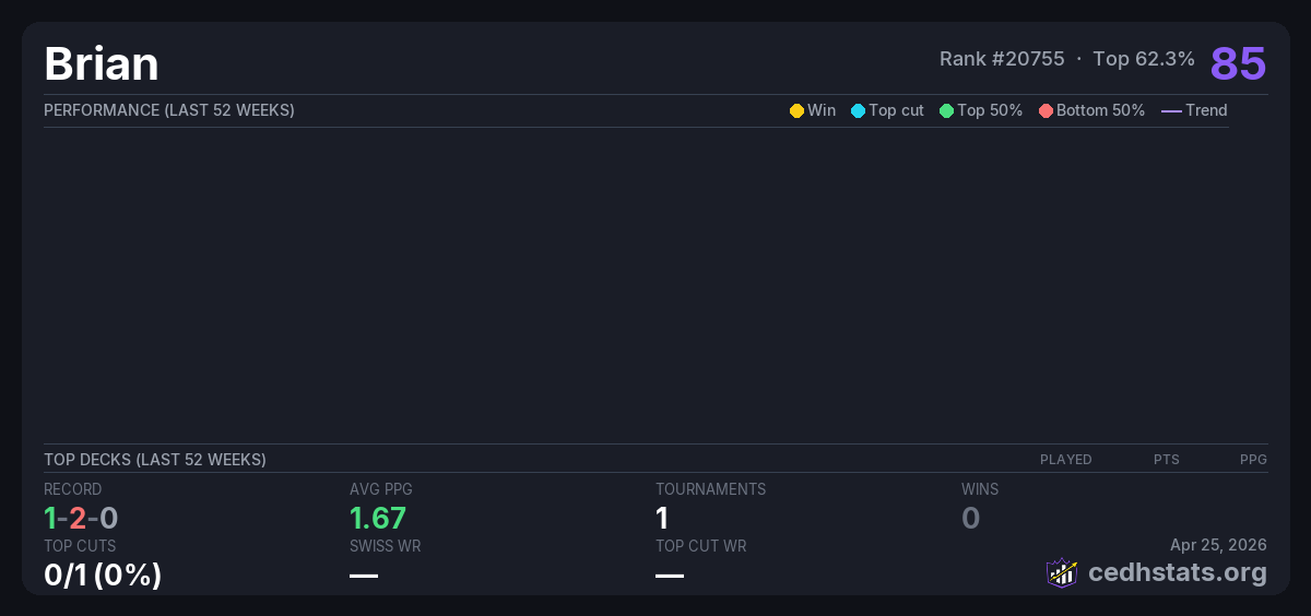 | Tournament | Deck | Result | Record | PPG | Points ? |