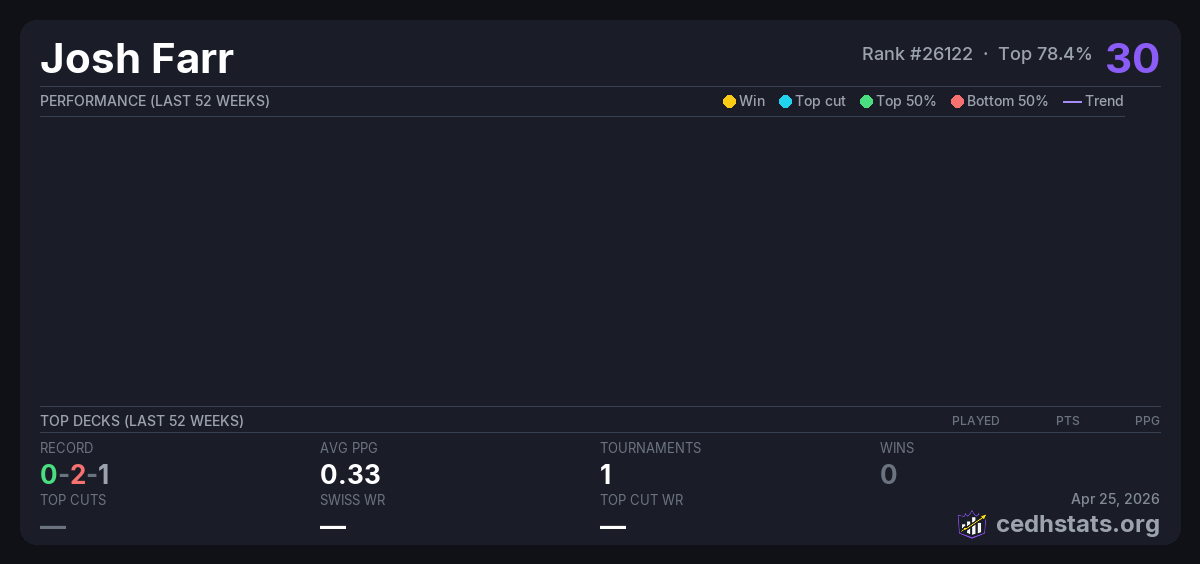 | FNM EDH 5-9-25 May 09, 2025 · 24 players | Invalid pairing | 17/24 | 0-2-1 | 0.33 | 30 |