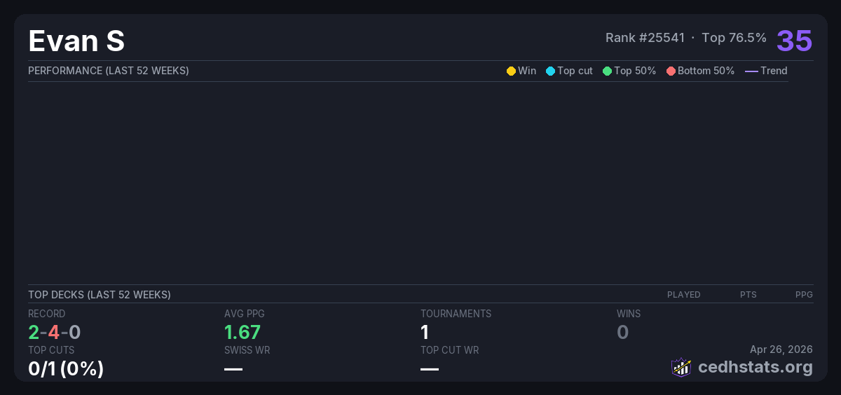 | The Iron Lion March CEDH League Mar 04, 2026 | — | 11/16 | 2-4-0 | 35 |