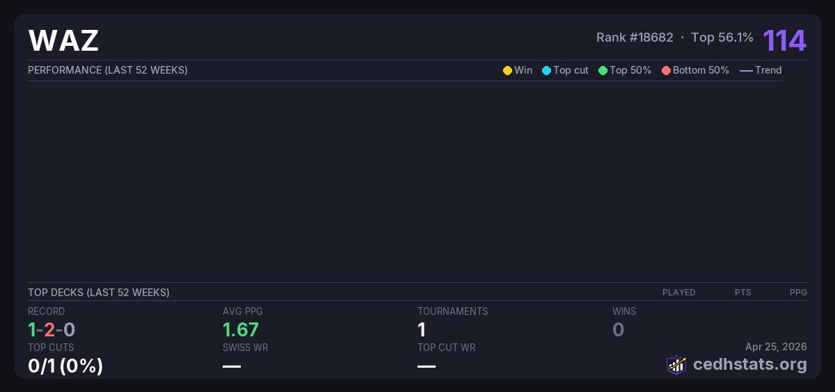 | 9月14日 CEDH月赛 Sep 14, 2025 · 24 players | Invalid pairing | 9/24 | 1-2-0 | 1.67 | 114 |