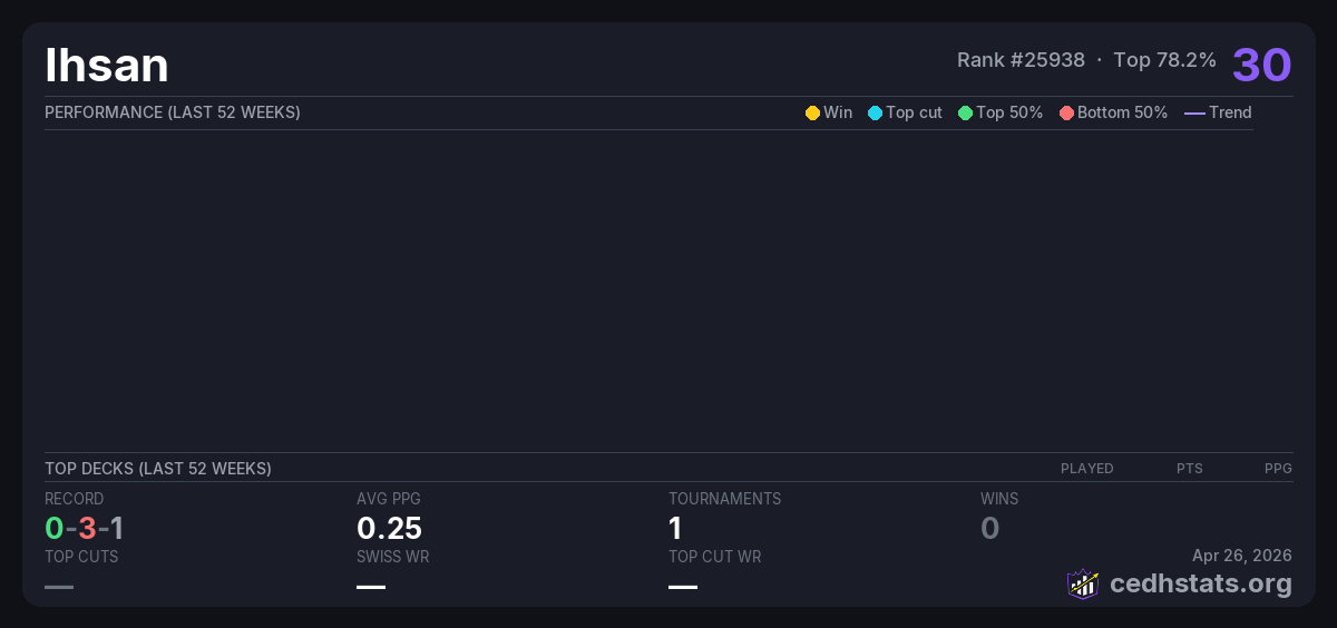 | Commander Bracket 3 @Kosa, by Play Inside May 10, 2025 · 16 players | Invalid pairing | 11/16 | 0-3-1 | 0.25 | 30 |