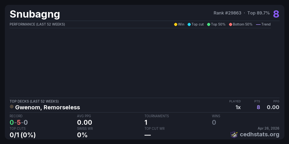 | 100% Dual Land CEDH Tournament Apr 25, 2026 · 32 players | Gwenom, Remorseless | 29/32 | 0-5-0 | 0.00 | 8 |