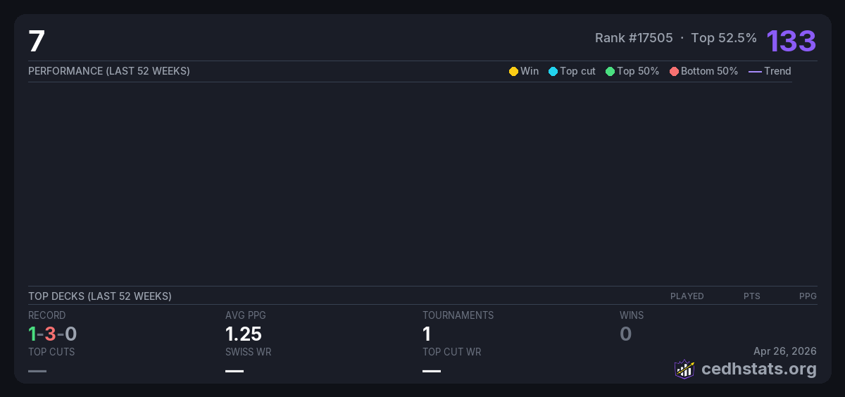 | TestUrMom Jul 22, 2025 · 23 players | Invalid pairing | 8/23 | 1-3-0 | 1.25 | 133 |