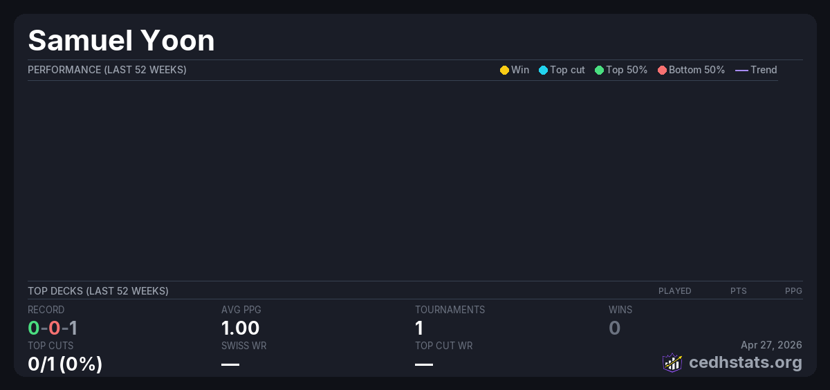 | Tournament | Deck | Result | Record | PPG | Points ? |