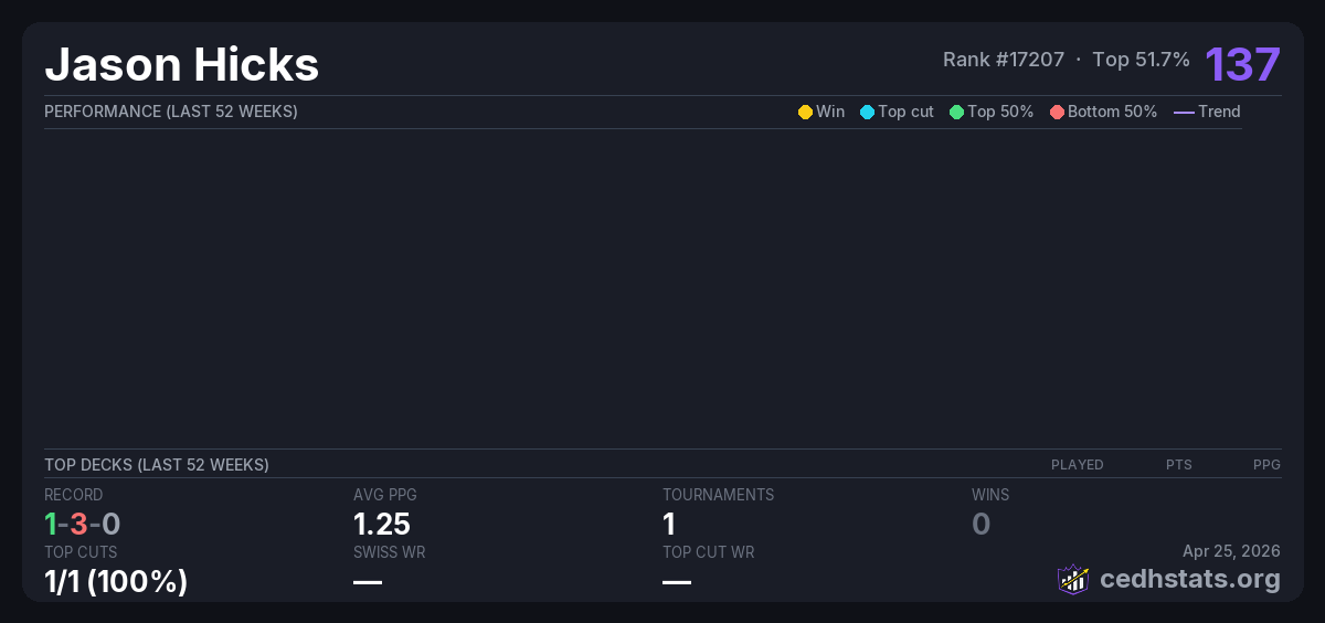 | $200 CEDH Win a Mox Aug 23, 2025 · 25 players | Invalid pairing | 9/25 | 1-3-0 | 1.25 | 137 |
