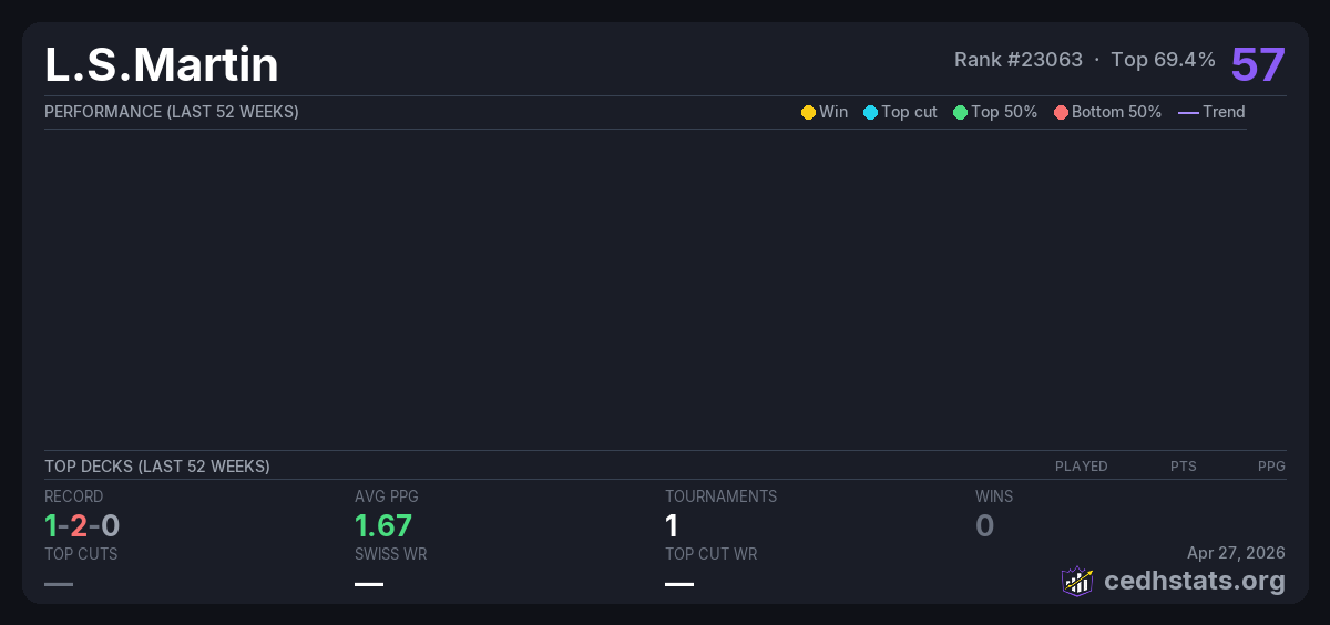 | Tournament | Deck | Result | Record | PPG | Points ? |