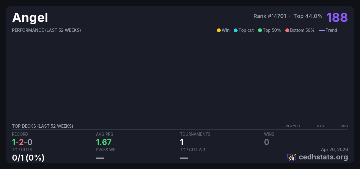 | Tundra Thirsty Thursday Mar 12, 2026 · 33 players | 8/33 | 1-2-0 | 1.67 | 188 |
