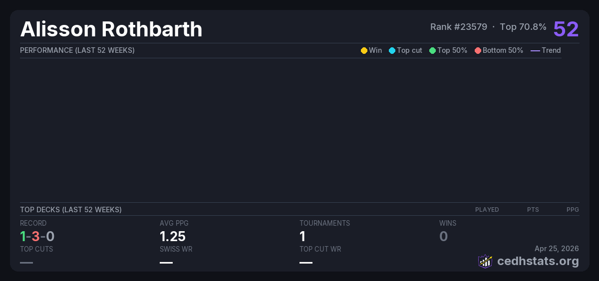 | Casa de Ruter CEDH Janeiro 2026 Jan 24, 2026 · 28 players | 17/28 | 1-3-0 | 1.25 | 52 |