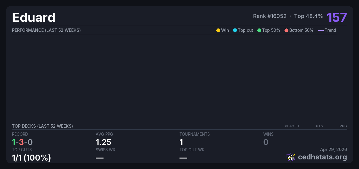 | Budjet 100 Agost Magic Events Aug 02, 2025 · 19 players | Invalid pairing | 7/19 | 1-3-0 | 1.25 | 157 |