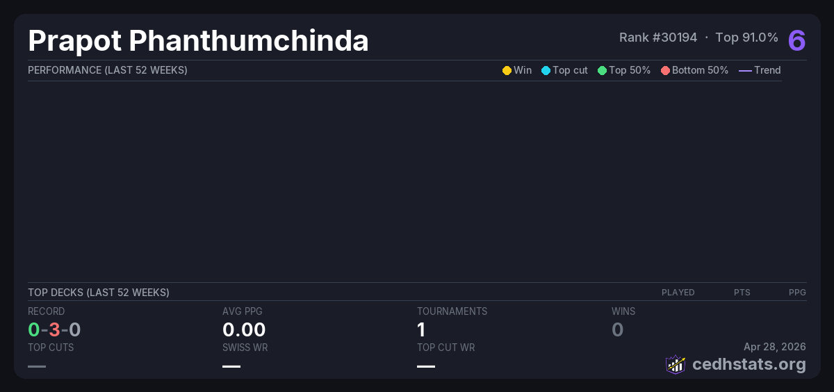 | Tournament | Deck | Result | Record | PPG | Points ? |
