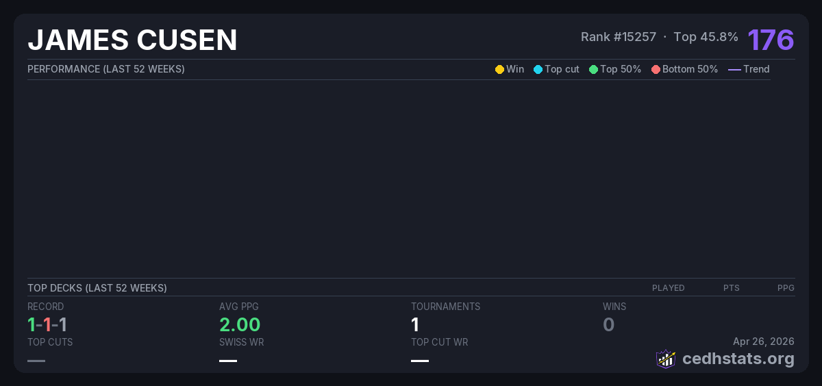 | CYDH May 22, 2025 · 20 players | Invalid pairing | 4/20 | 1-1-1 | 2.00 | 176 |