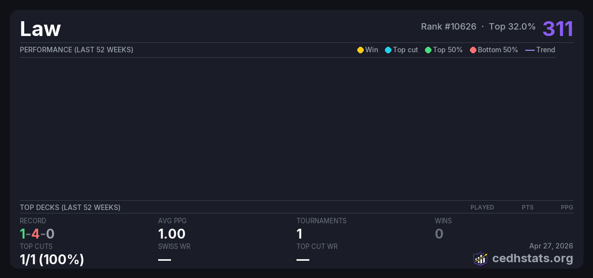 | Clash for the Cradle Sep 27, 2025 · 36 players | Invalid pairing | 8/36 | 1-4-0 | 1.00 | 311 |