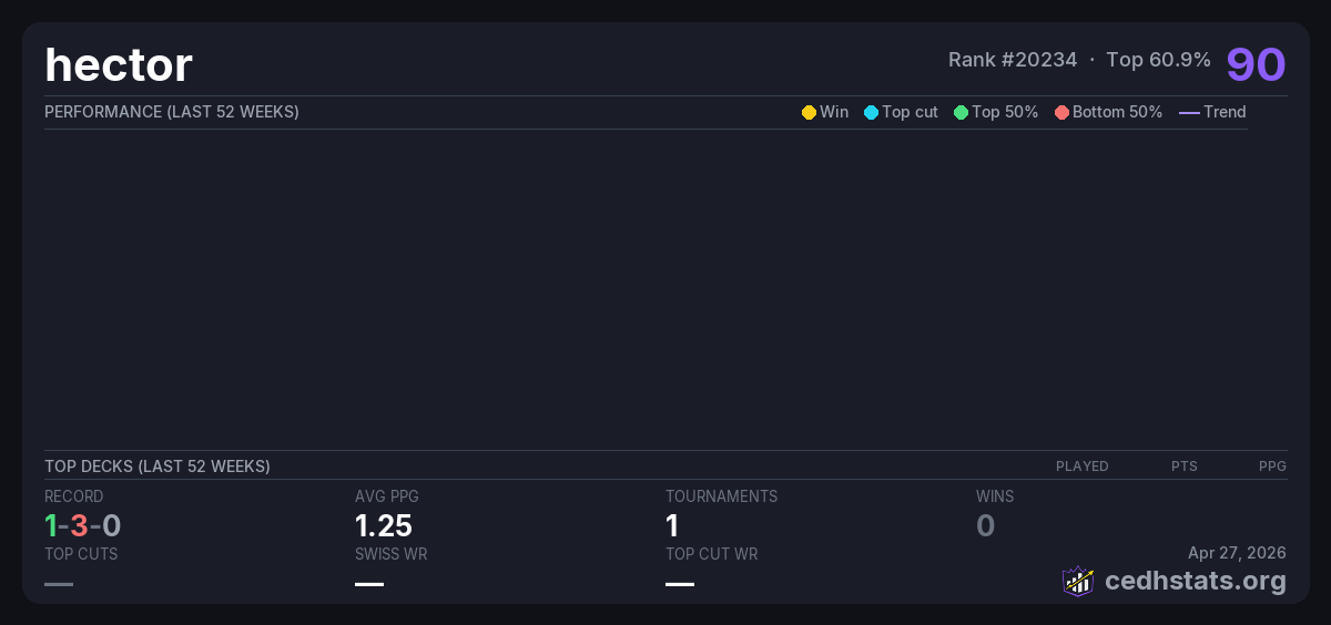 | THEONETOURNAMENTO Jan 19, 2026 · 16 players | 7/16 | 1-3-0 | 1.25 | 90 |