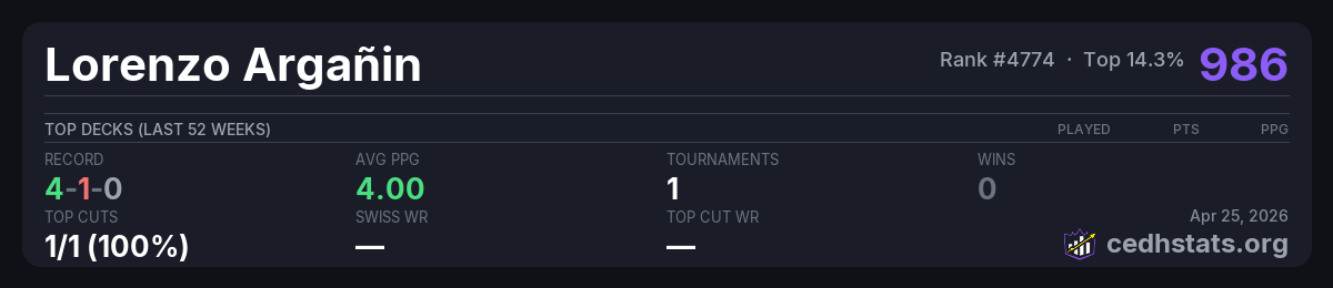 | Torneo Clasificatorio al HoF en el Ojo Apr 26, 2025 · 33 players | Stella Lee, Wild Card | 2/33 | 4-1-0 | 4.00 | 414 |