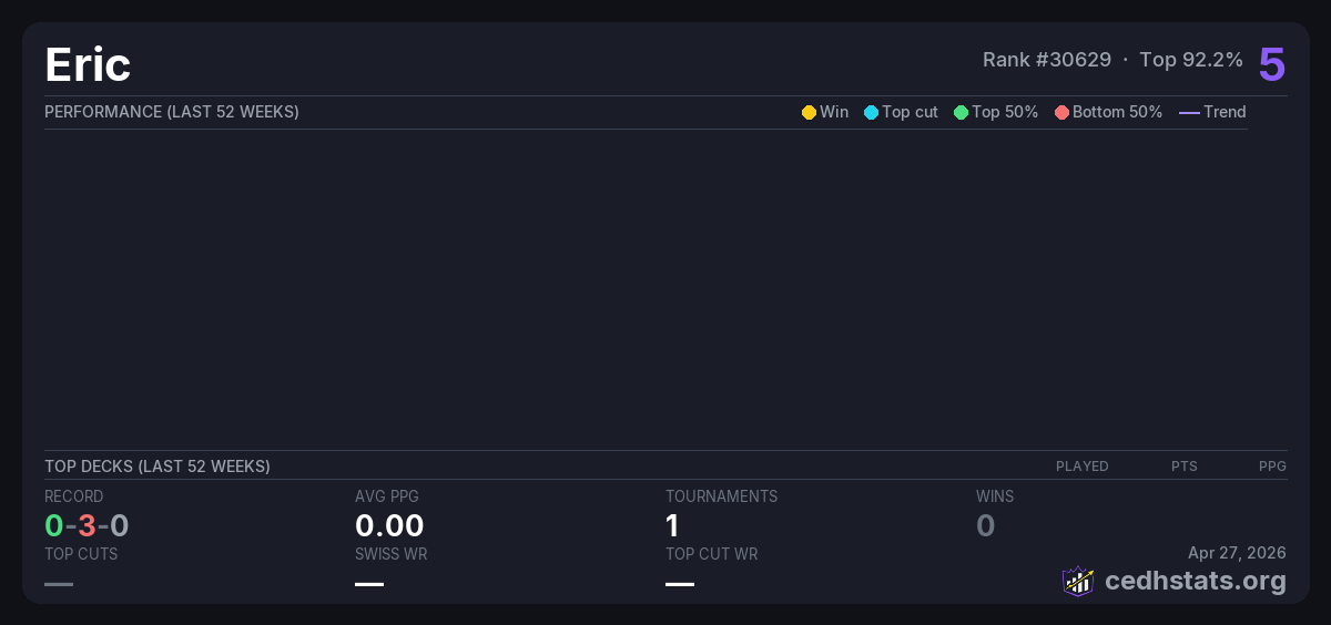 | Goblin Games & Hobby May 24, 2025 · 16 players | Invalid pairing | 13/16 | 0-3-0 | 0.00 | 5 |