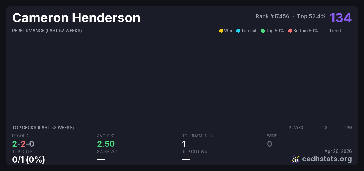 | Turbo Tower Commander 12/13 Dec 13, 2025 · 20 players | 6/20 | 2-2-0 | 2.50 | 134 |