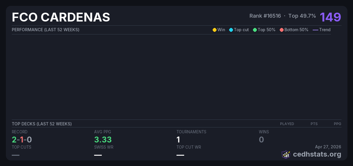 | PARA Jul 15, 2025 · 16 players | Invalid pairing | 4/16 | 2-1-0 | 3.33 | 149 |