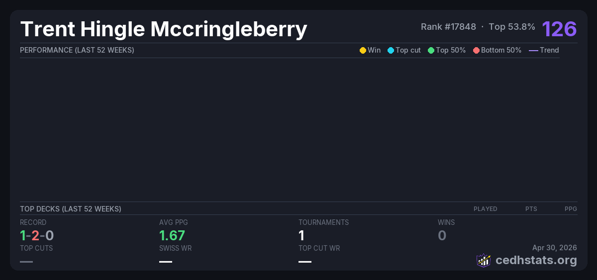 | LDC Commander Thursdays Apr 30, 2026 · 18 players | — | 9/18 | 1-2-0 | 1.67 | 126 |