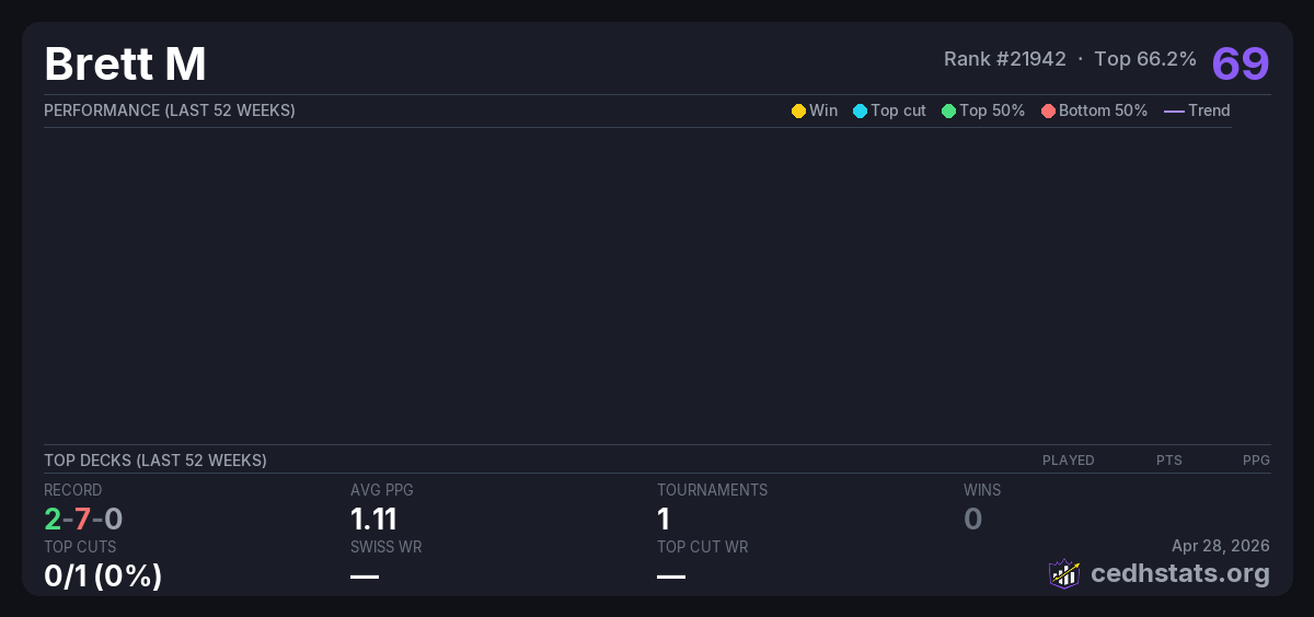 | The Iron Lion August CEDH League Aug 06, 2025 | — | 11/21 | 2-7-0 | 69 |
