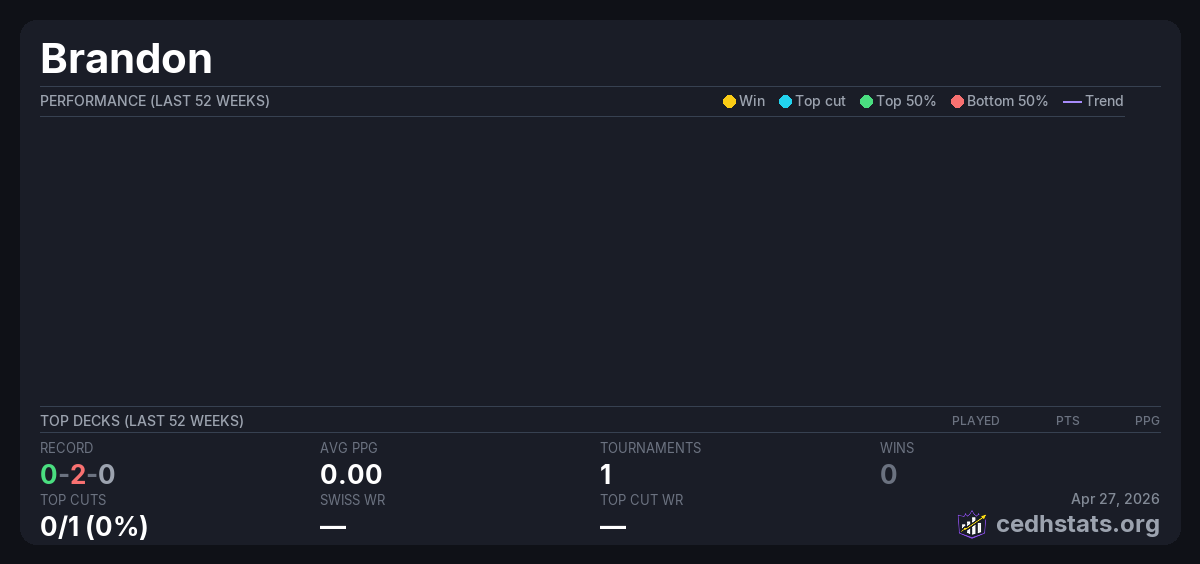 | weekly magic Apr 03, 2026 · 16 players | 11/16 | 0-2-0 | 0.00 | — |