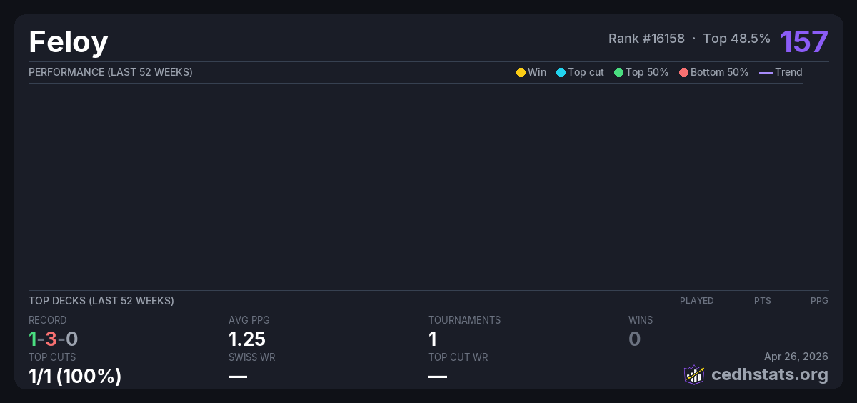 | 1st Qtr Dual - Underground Sea Jan 31, 2026 · 16 players | 4/16 | 1-3-0 | 1.25 | 157 |