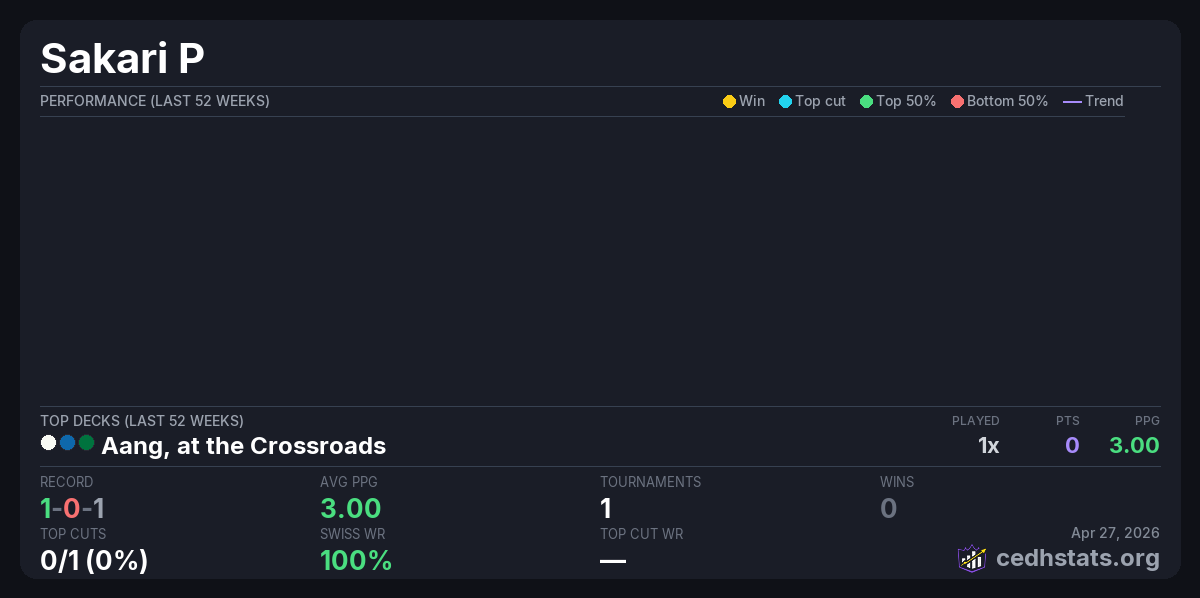 | CEDH FINSeries 25-26 #5/5 Apr 25, 2026 · 21 players | Aang, at the Crossroads // Aang, Destined Savior | 6/21 | 1-0-1 | 3.00 | — |
