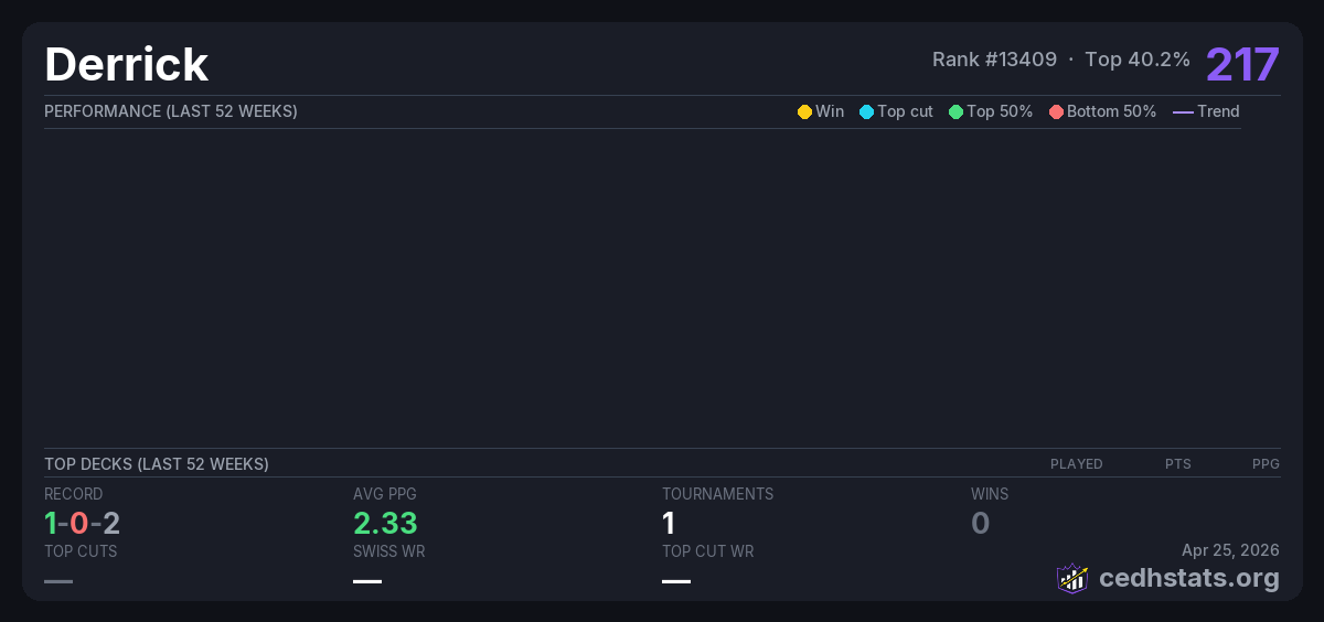| Unaltered Precon Oct 12, 2025 · 26 players | Invalid pairing | 4/26 | 1-0-2 | 2.33 | 217 |