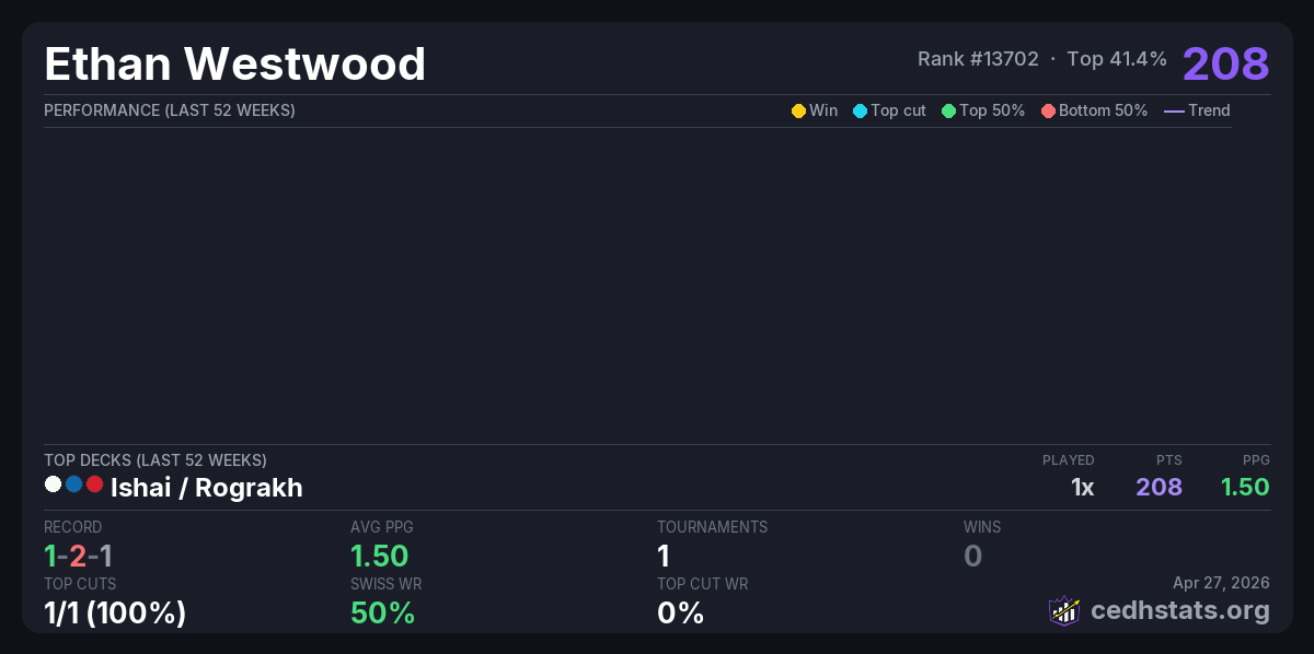 | Bondi Fetch Bonanza Apr 26, 2026 · 17 players | Ishai / Rograkh | 4/17 | 1-2-1 | 1.50 | 208 |
