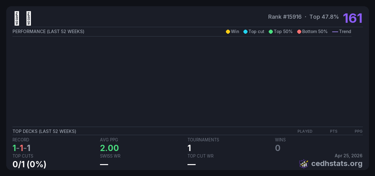 | 9月14日 CEDH月赛 Sep 14, 2025 | Invalid pairing | 6/24 | 1-1-1 | 161 |