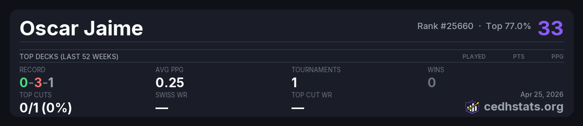 | Torneo Clasificatorio al HoF en el Ojo Apr 26, 2025 | Invalid pairing | 27/33 | 0-3-1 | 14 |