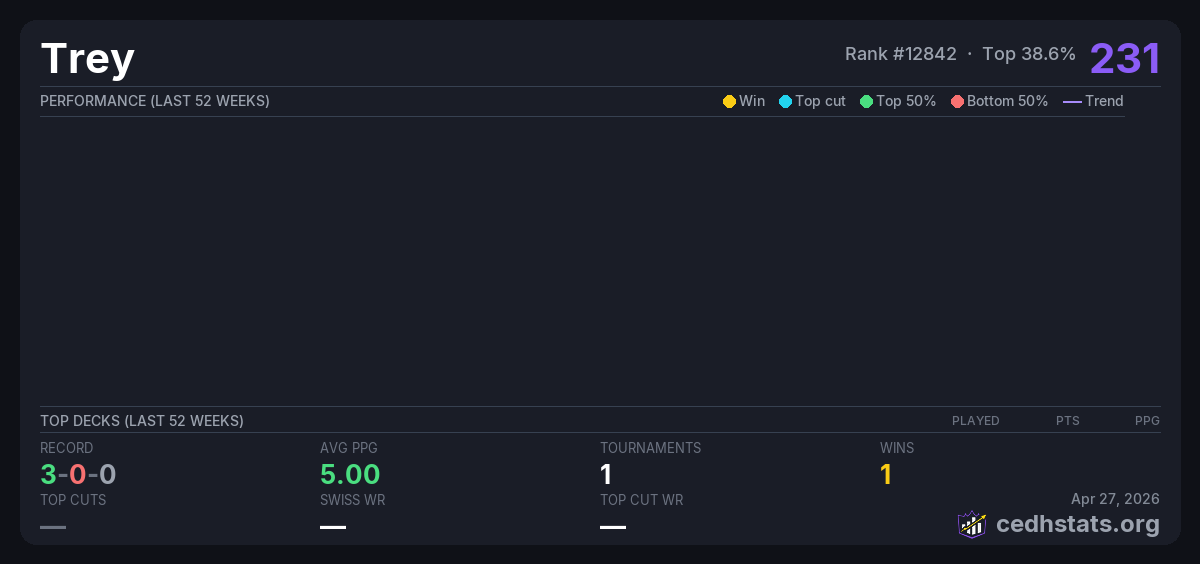 | Tournament | Deck | Result | Record | PPG | Points ? |