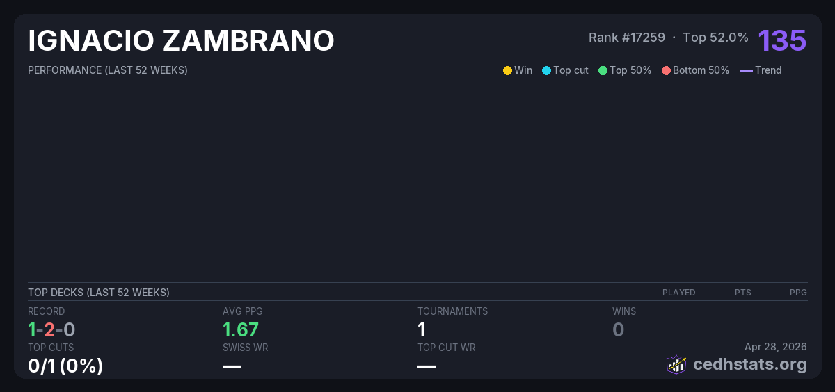 | CEDH PACTO HAMMER Oct 04, 2025 · 20 players | Invalid pairing | 6/20 | 1-2-0 | 1.67 | 135 |