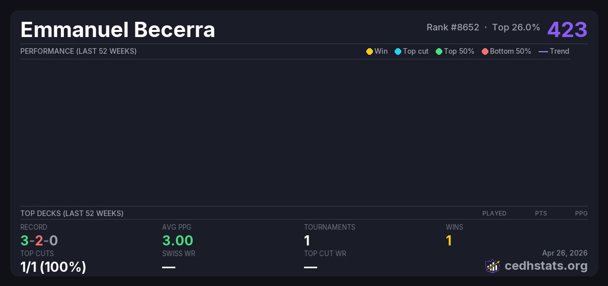 | Turbo Tower Commander 12/13 Dec 13, 2025 · 20 players | 1/20 | 3-2-0 | 3.00 | 423 |