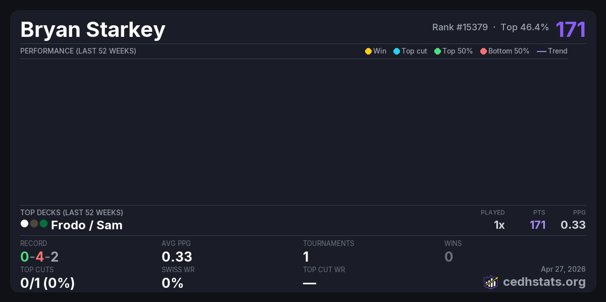 | Twisted Power - Midwest Gaming Classic TimeTwister Tournament Apr 25, 2026 · 172 players | Frodo / Sam | 97/172 | 0-4-2 | 0.33 | 171 |