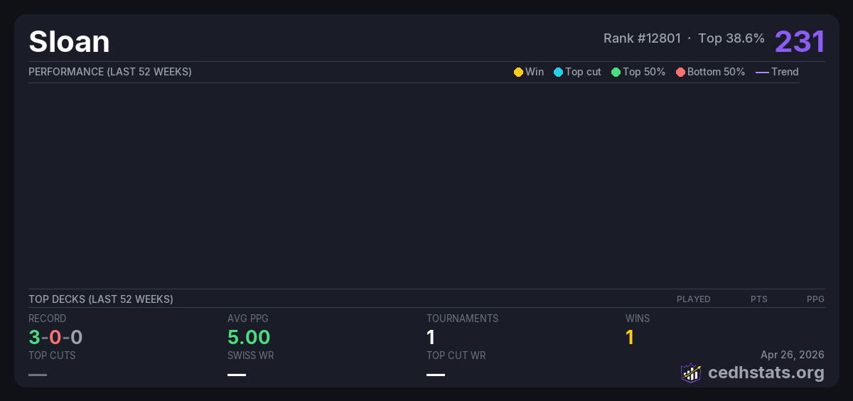 | Commander League 3 week 5 Mar 14, 2026 | 1/16 | 3-0-0 | 231 | |