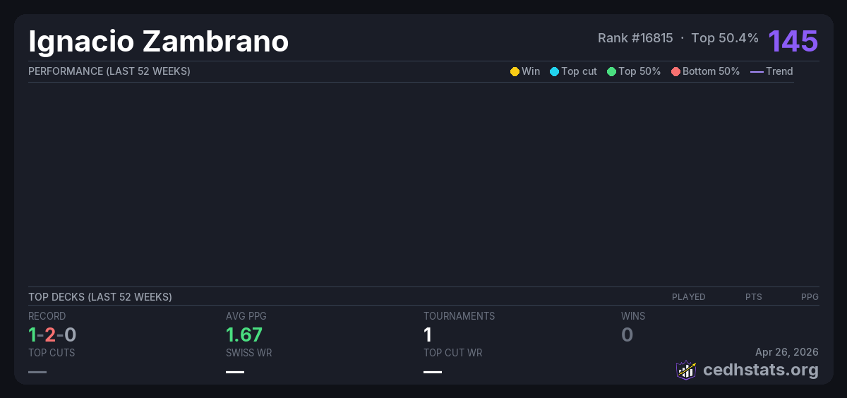 | EDH Hammer Bracket 3 14/03 Mar 14, 2026 · 17 players | 4/17 | 1-2-0 | 1.67 | 146 |