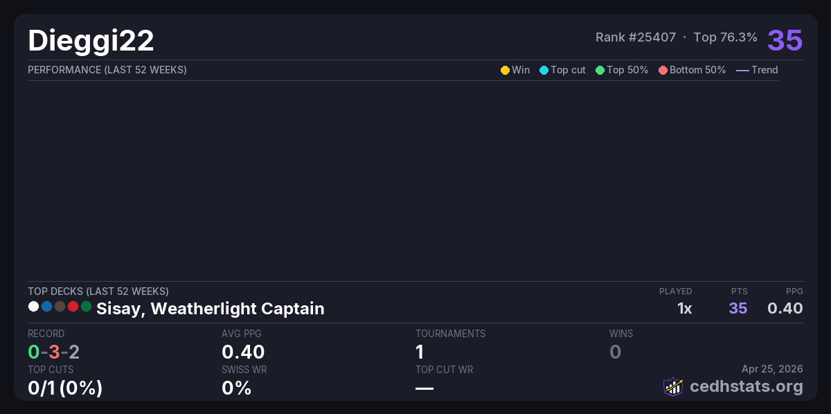 | CEDH Pamplona 2 Mar 14, 2026 · 66 players | Sisay, Weatherlight Captain | 53/66 | 0-3-2 | 0.40 | 35 |