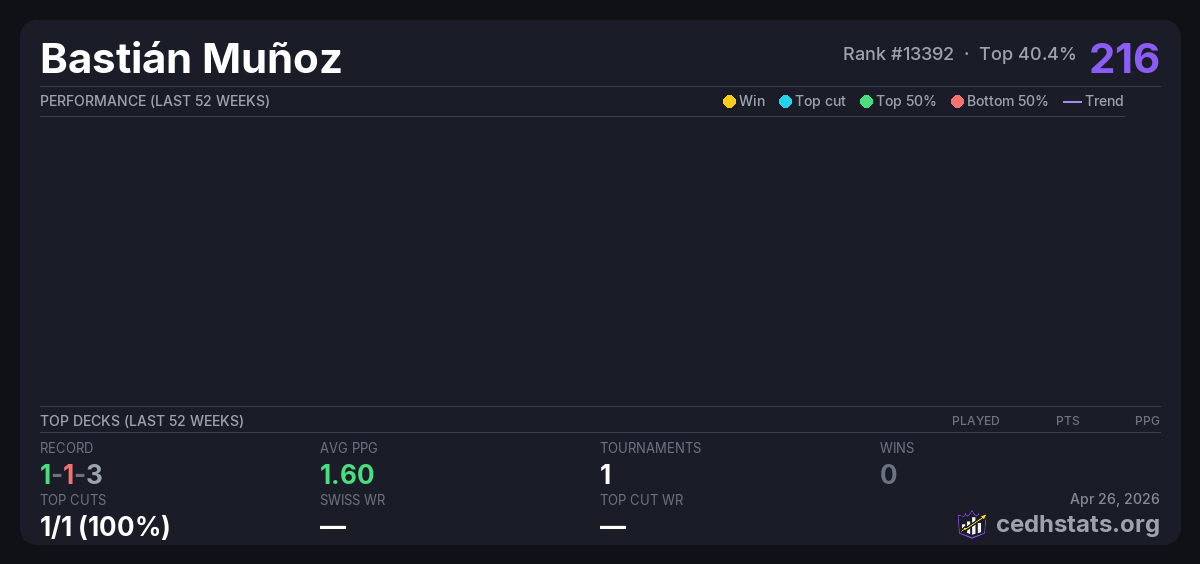 | 1er Torneo Universes Beyond - Comunidad Commander C3 Dec 13, 2025 · 18 players | 3/18 | 1-1-3 | 1.60 | 216 |
