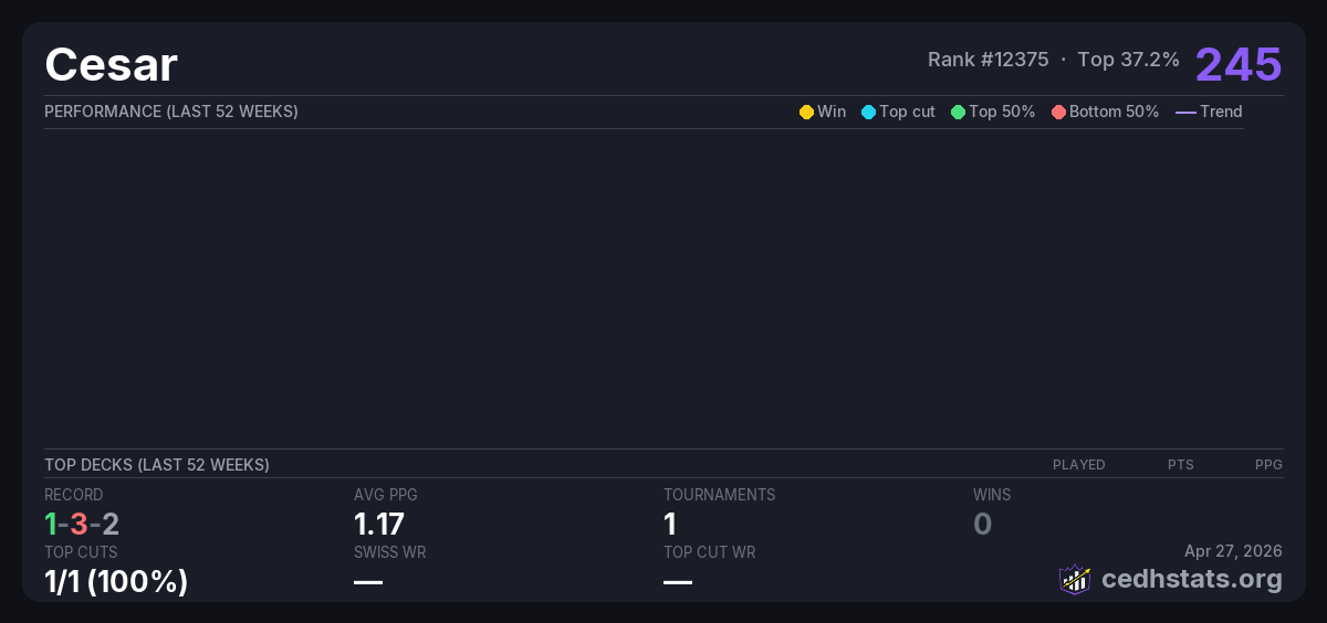 | Casual Flip Commander Jan 25, 2026 · 16 players | 4/16 | 1-3-2 | 1.17 | 245 |