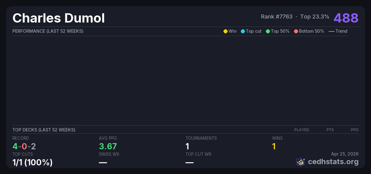 | Tournament | Deck | Result | Record | PPG | Points ? |
