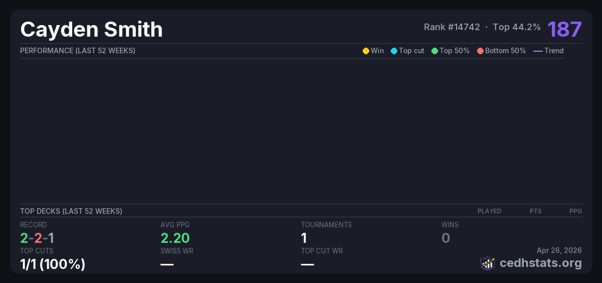 | August EDH Tourn Aug 31, 2025 | Invalid pairing | 4/18 | 2-2-1 | 187 |