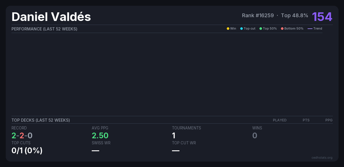 | Reino de Bolsillo 12-Abril Apr 12, 2026 · 20 players | 5/20 | 2-2-0 | 2.50 | 154 |