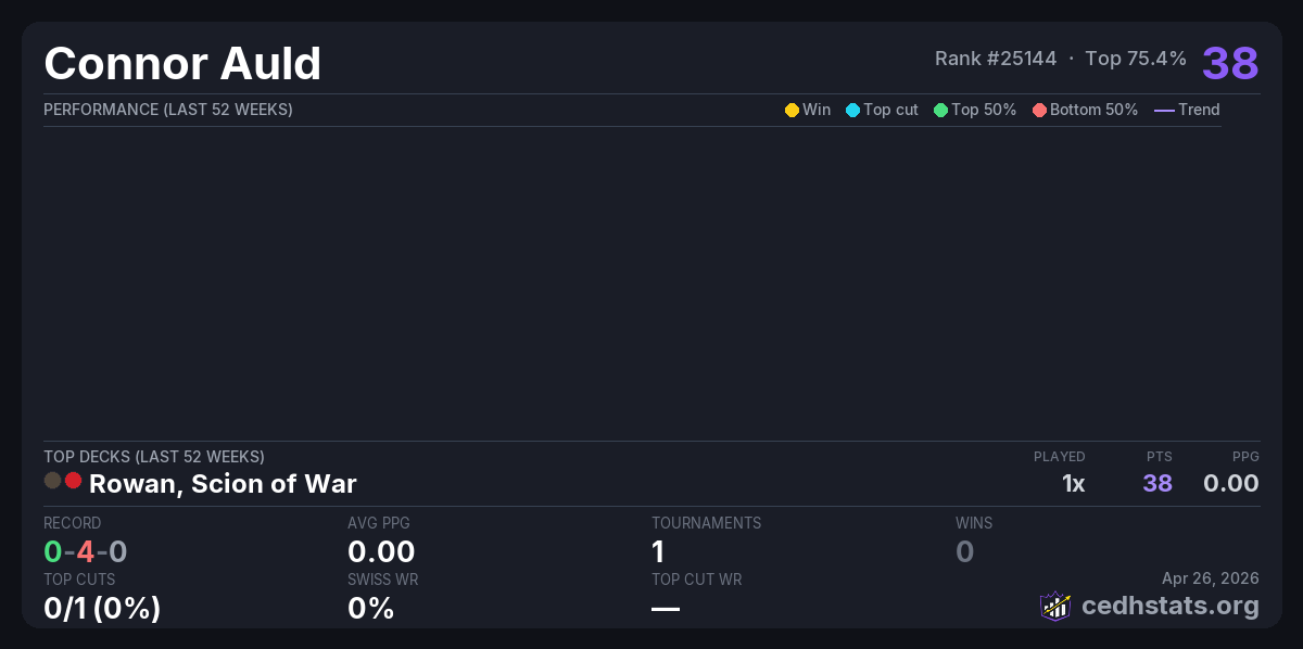 | cEDH Unleashed! @ MTG MATE Apr 25, 2026 · 42 players | Rowan, Scion of War | 32/42 | 0-4-0 | 0.00 | 38 |