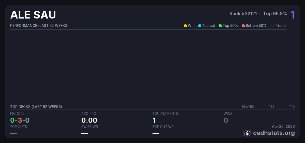 | CEDHX Oct 23, 2025 · 16 players | Invalid pairing | 16/16 | 0-3-0 | 0.00 | 1 |