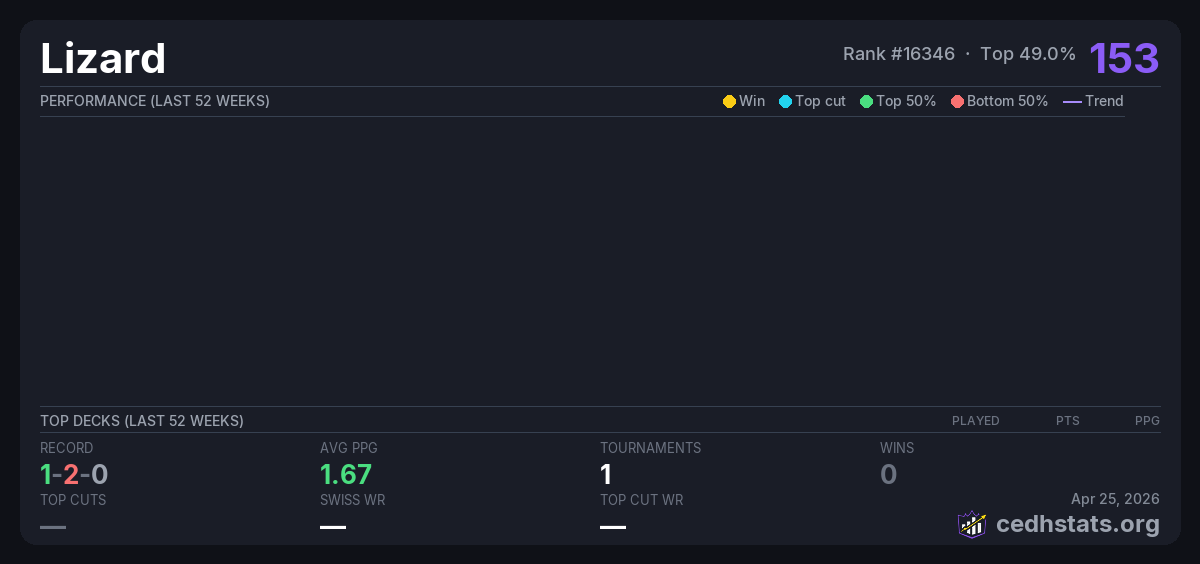 | Commander League 3 week 2 Feb 07, 2026 · 20 players | 5/20 | 1-2-0 | 1.67 | 153 |