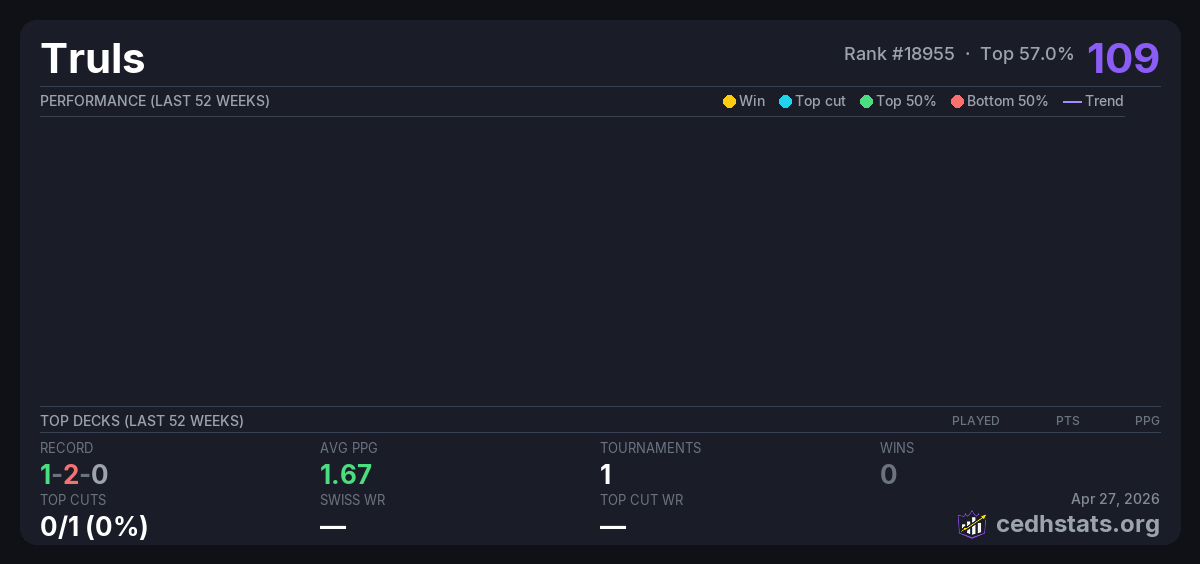 | cEDH Drammen 2025 Nov 15, 2025 | Invalid pairing | 6/16 | 1-2-0 | 109 |