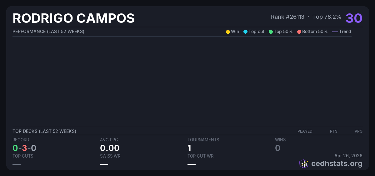 | p.a.rra Sep 16, 2025 · 20 players | Invalid pairing | 14/20 | 0-3-0 | 0.00 | 30 |