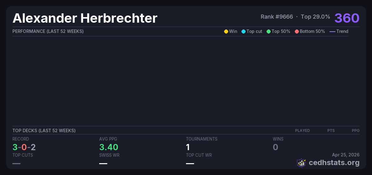 | Commandernight 26.10.2025 Oct 26, 2025 | Invalid pairing | 2/57 | 3-0-2 | 360 |